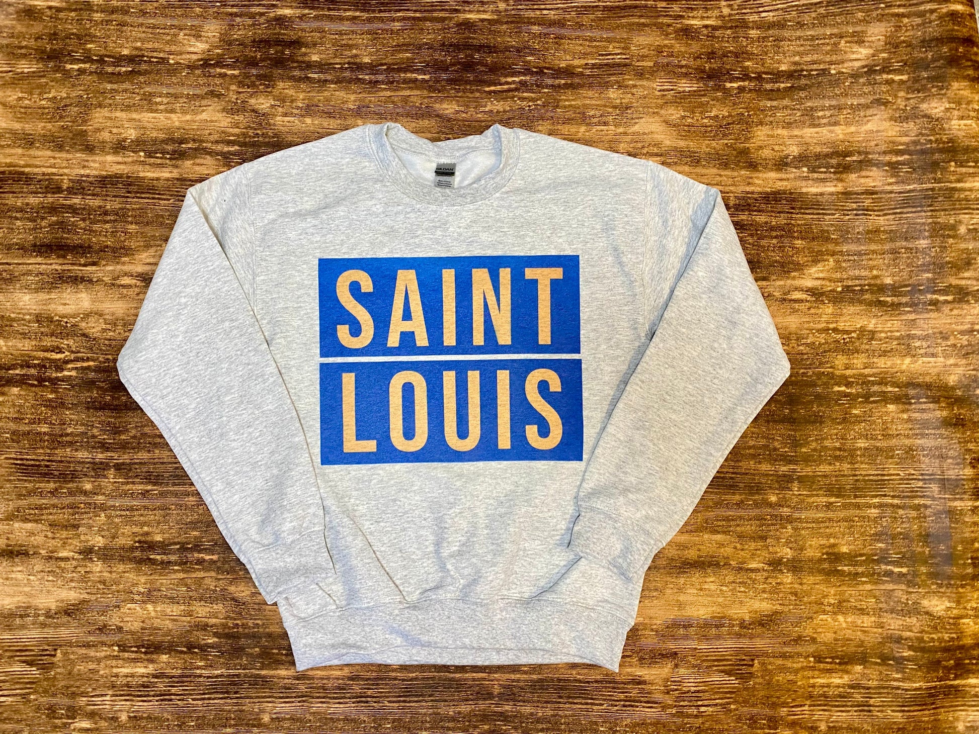Blue and Yellow Box logo Saint Louis sweatshirt. Design is sublimation which means the ink is dyed into the fabric. Sweatshirts are a poly cotton blend. They are unisex and fit true to size. For a more oversized fit I recommend sizing up.
